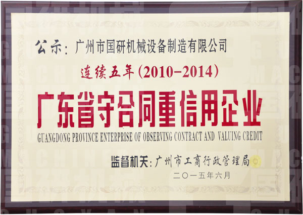 “连续五年(2010-2014)广东省守合同重信用企业”的牌匾在广州市国研机械设备制造有限公司的文化展示墙上格外引人注目,这是对公司多年坚持诚信经营的充分肯定,也是公司HTH华体会体育登录入口“诚信、创新、分享、精进”的客观体现。