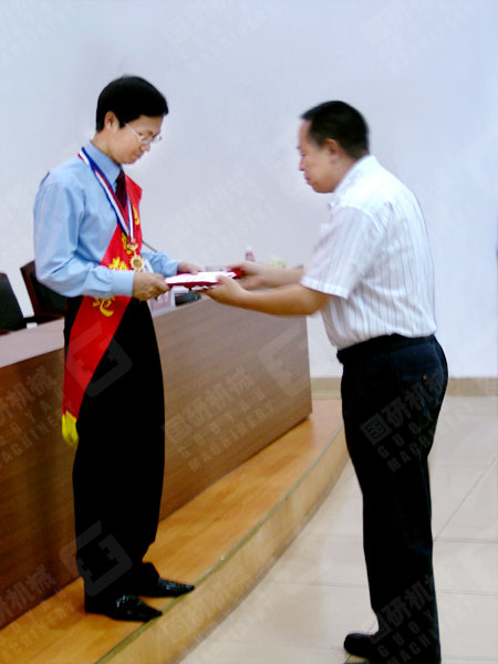 大会在庄严的国歌声中拉开了序幕。胸戴大红花,身披绶带的广州市劳动模范、国研机械市场部经理刘启刚同志受到了公司领导和全体员工的热烈欢迎。董事长兼总经理王声位亲自为刘启刚同志佩戴广州市委、市政府颁发的广州市劳动模范奖状并颁发奖金。